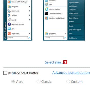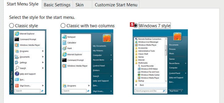 I menuen Skin 4 vælger du et passende farvetema og layout 5 for menuen. Når det er gjort, klikker du på Start Menu Style 6.