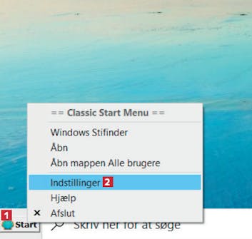 Du åbner som altid Classic Shells indstillinger ved at højreklikke på startknappen 1 og vælge Indstillinger 2.