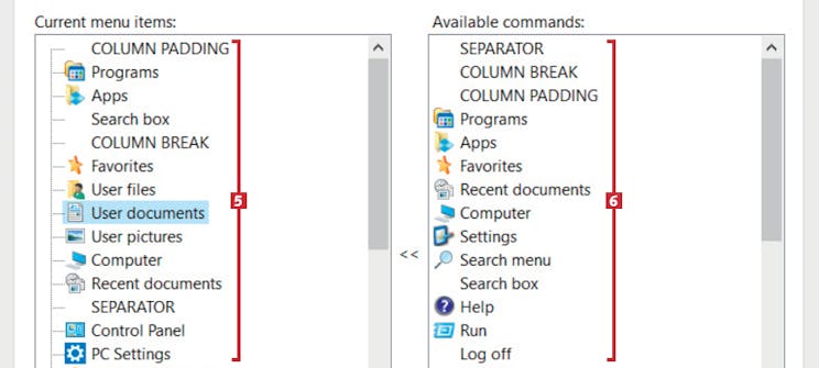 Hvis du har valgt menuen Classic style eller Classic with two columns, vil indstillingsvinduet se ud som her. Hop frem til trin 6, hvis du har valgt Windows 7 Style. Venstre kolonne 5 viser de nuværende elementer i startmenuen. Højre kolonne viser alternativer 6 som du kan tilføje.