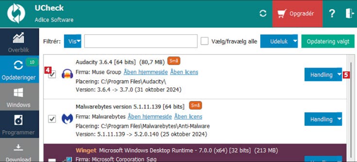 Denne side åbner, hvor du ser alle programmer, der mangler at blive opdateret. Klik i feltet ud for de programmer, der skal opdateres, så der kommer et flueben 4, og klik på knappen Handling 5 til højre i programmet.