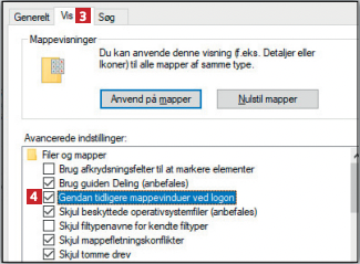 Klik på Vis 3 , og marker Gendan tidligere mappevinduer ved logon 4 . Klik på Anvend og OK.
