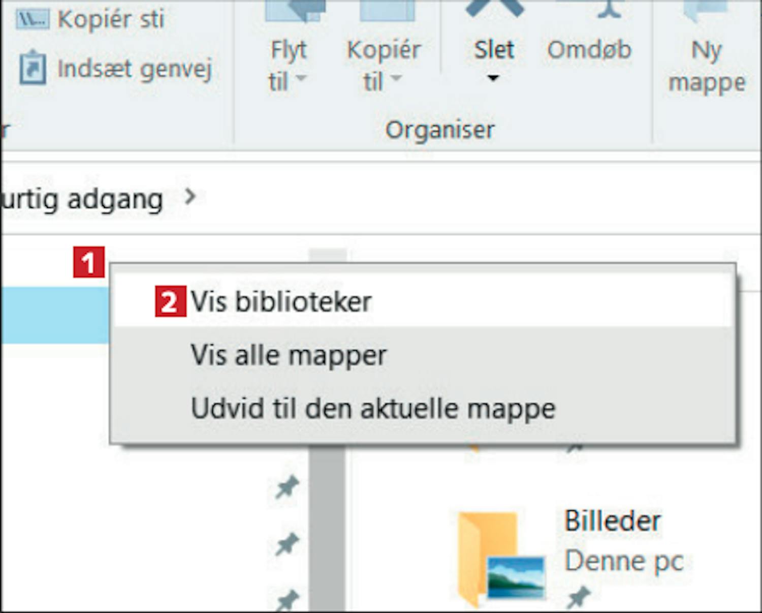 Højreklik i et tomt område i panelet til venstre i Stifinder 1 , og vælg Vis biblioteker 2.