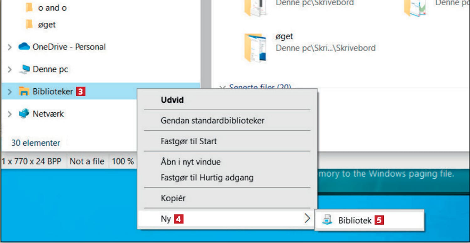 Højreklik på Biblioteker 3 , og vælg Ny 4 (i Windows 11 skal du først vælge punktet Vis flere indstillinger nederst i højreklikmenuen). Klik så på Bibliotek 5 .