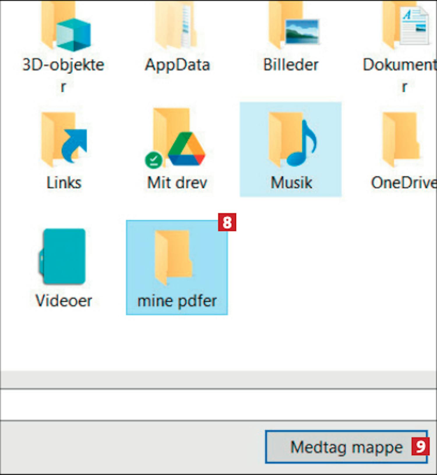Udpeg en eller flere mapper med PDF-filer 8 i Stifinder, og klik på Medtag mappe 9 .
