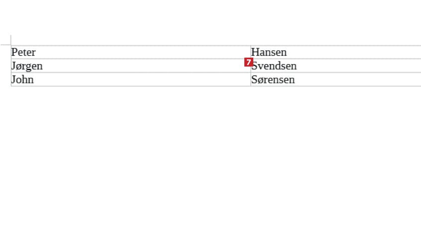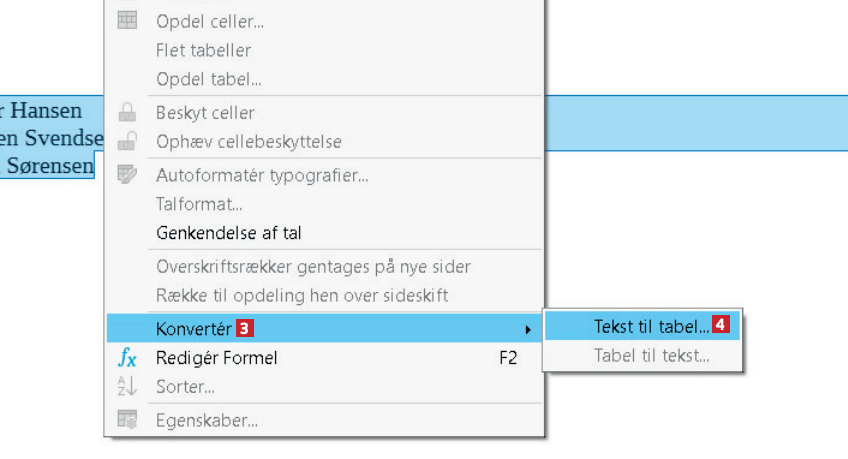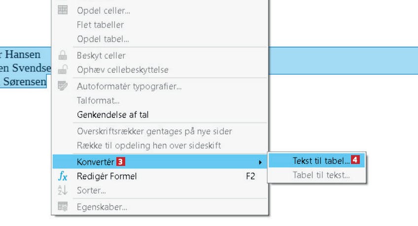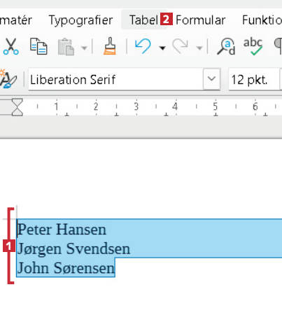 I dokumentet står tre navne 1, som vi gerne vil have i tabelform, så for- og efternavne får hver deres kolonne. Klik på Tabel 2.