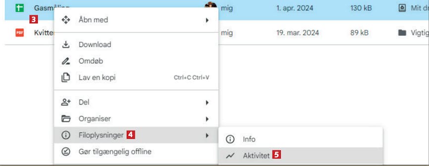 Højreklik 3 på dit regneark i oversigten i Google Drev, kør musen ned til Filoplysninger 4 og klik på Aktivitet 5.