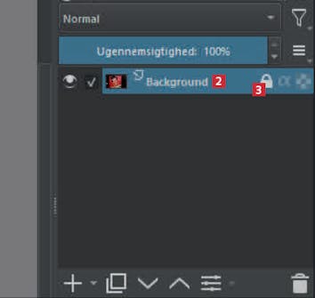I panelet kan du allerede se dit eksisterende billede, som har fået navnet Background 2. Det er en god idé at låse baggrundslaget indtil videre ved at klikke på hængelåsen 3.