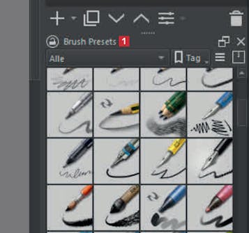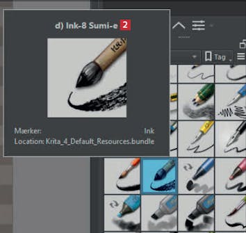 Her gælder det om at prøve sig frem, til du finder en pensel, du synes om. Her vælger vi denne, d) ink-8 Sumi-e 2.