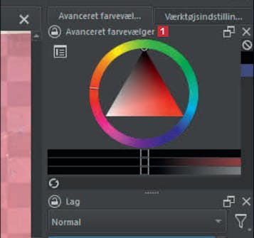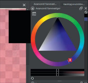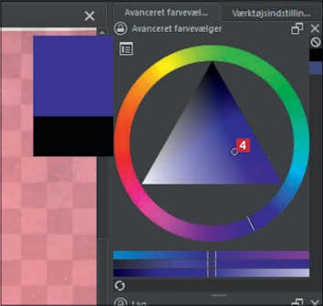 Nu har panelet en fornuftig størrelse. Vælg så først en farve ved at klikke med musen i den ydre ring 3 i farvevælgeren.