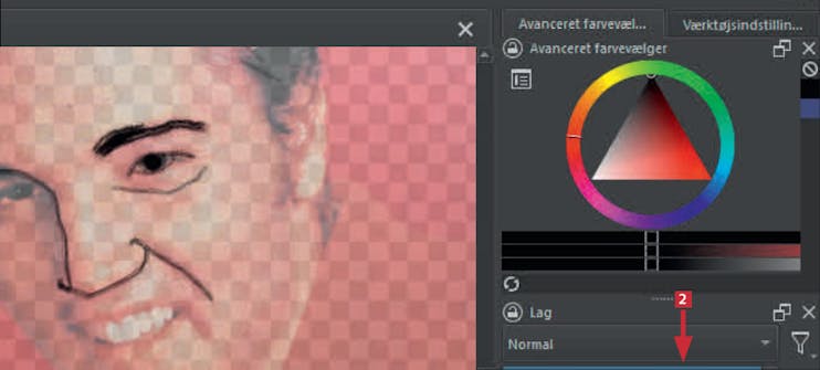 Du kan gøre farvevælgeren større ved at klikke på og så trække i prikkerne 2 i bunden af panelet. Så bliver det nemmere at ramme den rigtige farve.