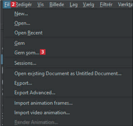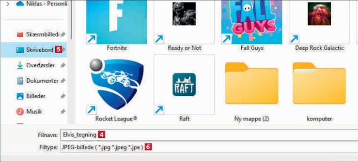 Giv nu din tegning et navn 4 og vælg, hvor på computeren, den skal gemmes henne 5.Vælg derefter et format, som JPEG 6 eller PNG. Vær opmærksom på, at dine synlige lag lægges sammen til ét lag, når du gemmer i dette format.