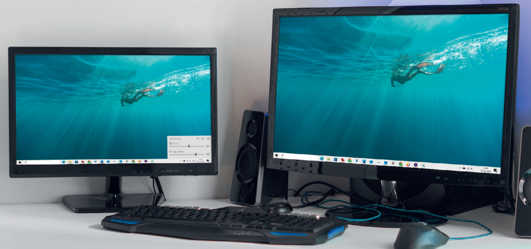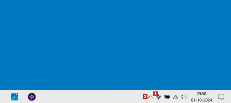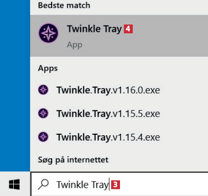Ud over automatisk at justere lysstyrken på din skærm løbende, kan du også bruge Twinkle Tray til at ændre pc-skærmens lys, når du får brug for det. Det gør du ved at klikke på programmets ikon på proceslinjen 1. Bemærk at ikonet kan være gemt bag pilen 2, som du så skal klikke på først.