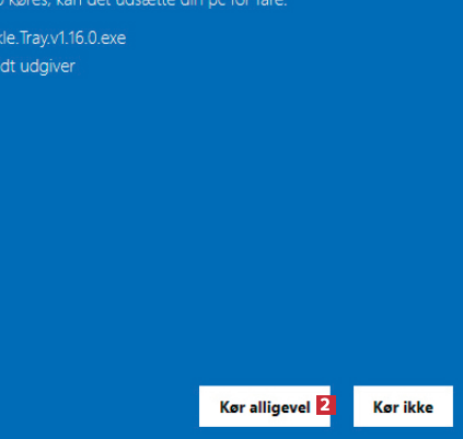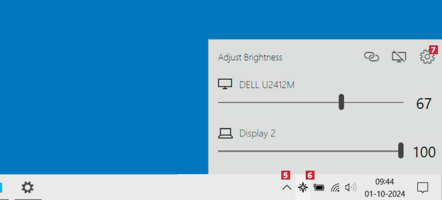 Programmet ligger nu i meddelsesområdet ved uret i Windows. Det kan eventuelt være gemt bag pilen 5, som du i givet fald skal klikke på først. Klik på programmets ikon 6, og derefter på tandhjulet 7.