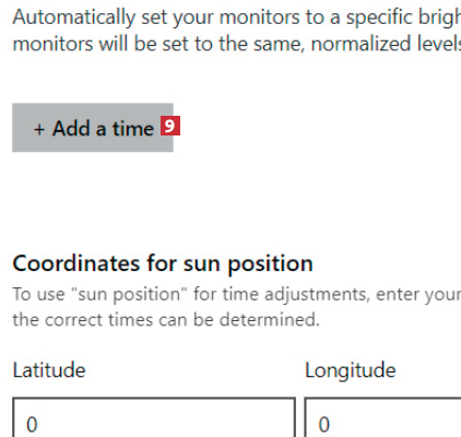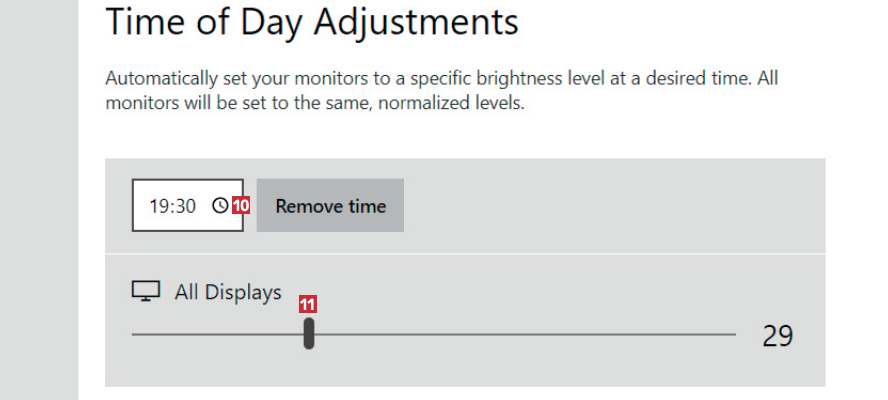 Klik på urskiven 10, og vælg et klokkeslæt. Vælg derpå den lysstyrke 11, der skal skiftes til på det angivne tidspunkt, fx mere dæmpet lys om aftenen. Ændringerne gemmes automatisk og gælder for alle skærme. Derpå kan du gentage metoden i trin 6 og 7 og sætte lysstyrken op, når der igen er dagslys.