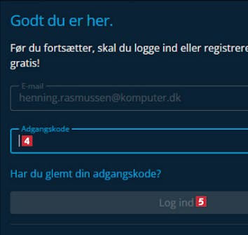 Hvis du allerede er registreret hos Ashampoo, skal du taste din adgangskode 4 og klikke på Log ind 5. Ellers får du en mail med et link til at oprette dig som bruger.