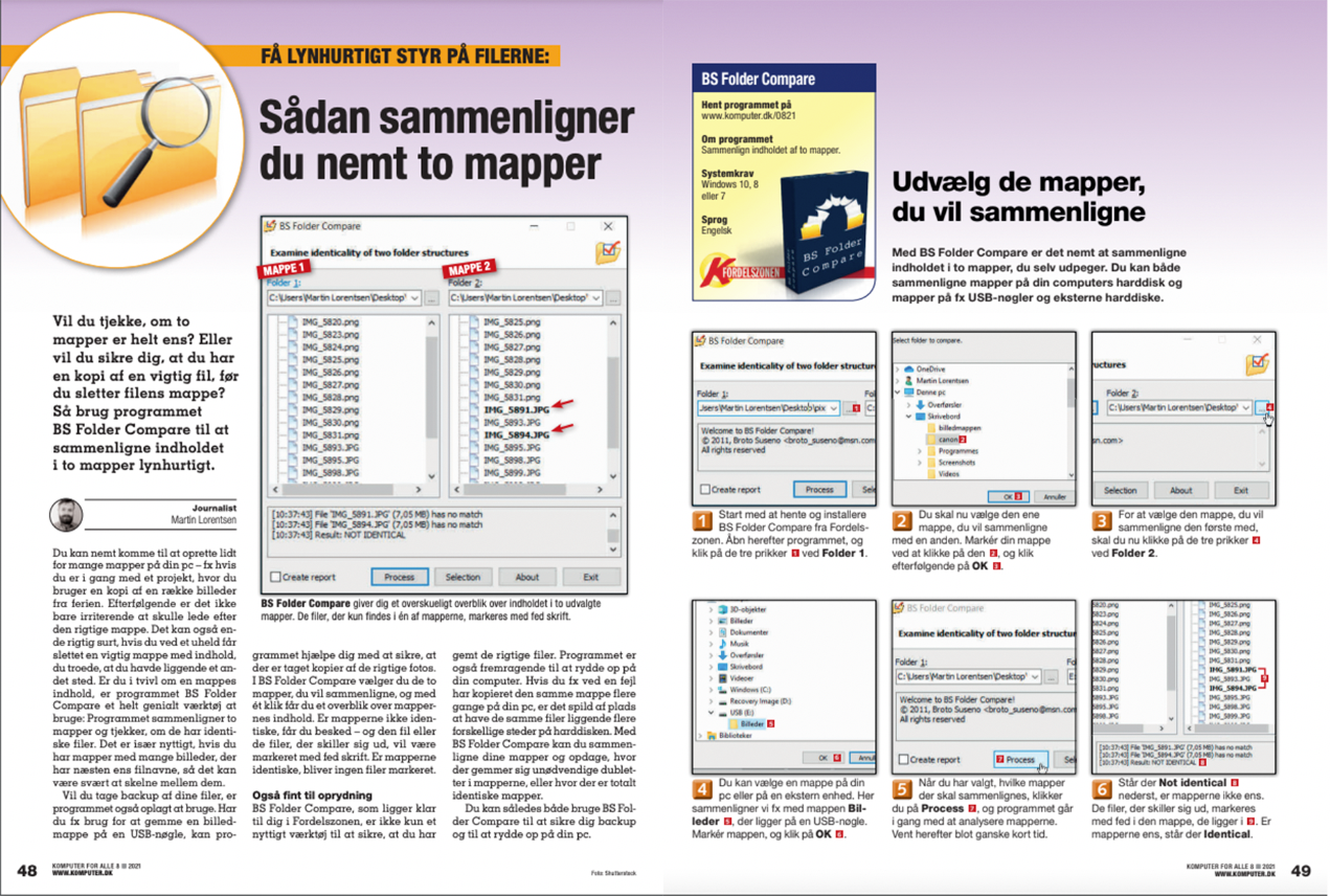 Værktøjsprogrammer Sådan sammenligner du nemt to mapper Vil du tjekke, om to mapper er helt ens? Eller vil du sikre dig, at du har en kopi af en vigtig fil, før du sletter filens mappe? Så brug programmet BS Folder Compare til at sammenligne indholdet i to mapper lynhurtigt.
