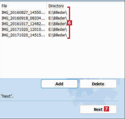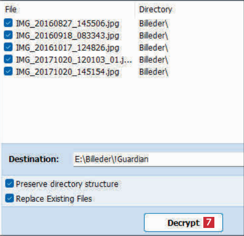 Nu vises indholdet af filer i den krypterede fil 4. Kryds de filer af, du vil dekryptere 5. Klik på mappeikonet 6 og udpeg den mappe, du vil gemme filerne i.