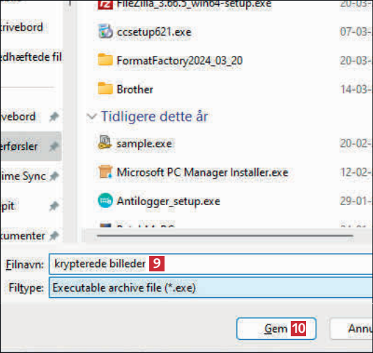 Udpeg en mappe, hvor du vil gemme det krypterede arkiv, skriv et navn til filen 9 og klik på Gem 10.
