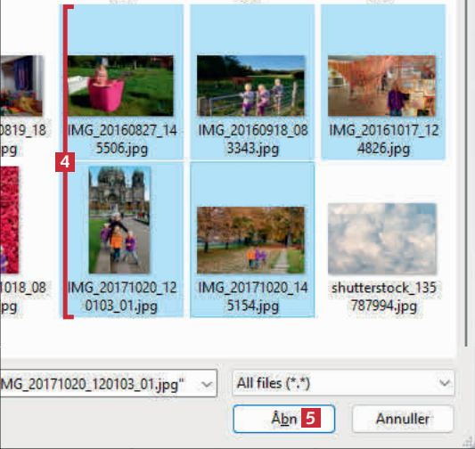 Navigér hen til den mappe, der rummer de filer, du vil beskytte. Vælg filerne med museklik, mens du holder CTRL nede 4 og klik på Åbn 5.