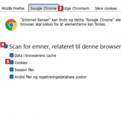 I toppen af vinduet kan du vælge indstillinger for hver af dine browsere – fx Chrome 3. Vælg, om du vil slette alle gemte data 4, eller fx vil bevare cookies 5. Klik på OK.