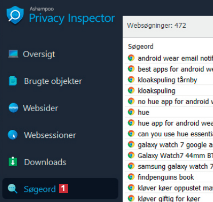 Her kan du se afsløringen af alle de ord, du har søgt efter på nettet. Søgeord kan være ekstremt afslørende for uvedkommende personer, men du kan nemt slette oplysningerne ved at klikke på kost-ikonet.