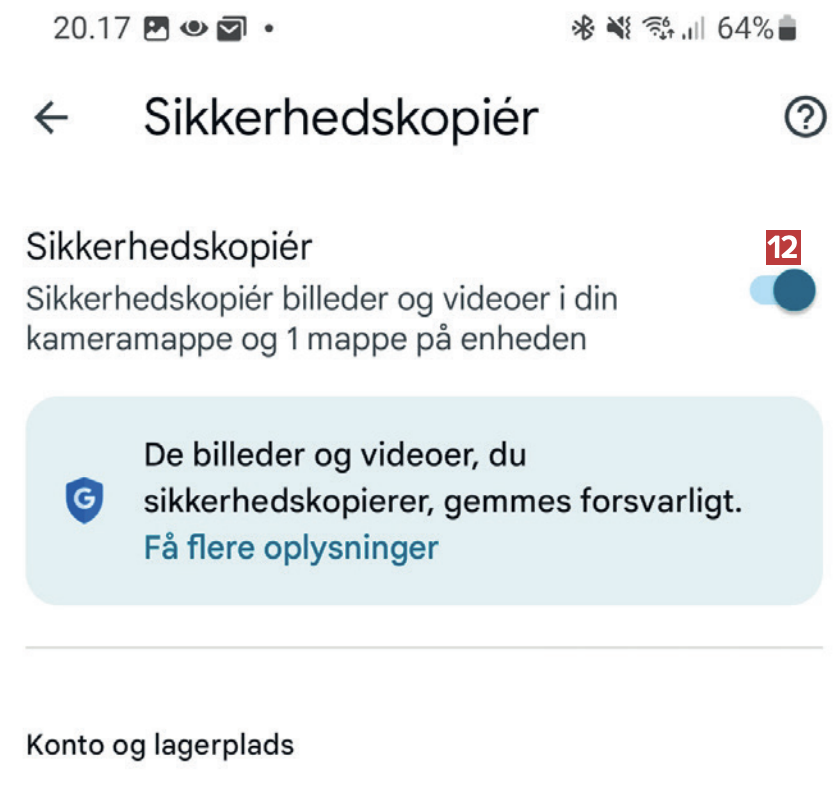 Du kan sikkerhedskopiere Billeder og videoer 6, hvis du betaler for ekstra lagerplads. Tryk på Andre enhedsdata 7.
