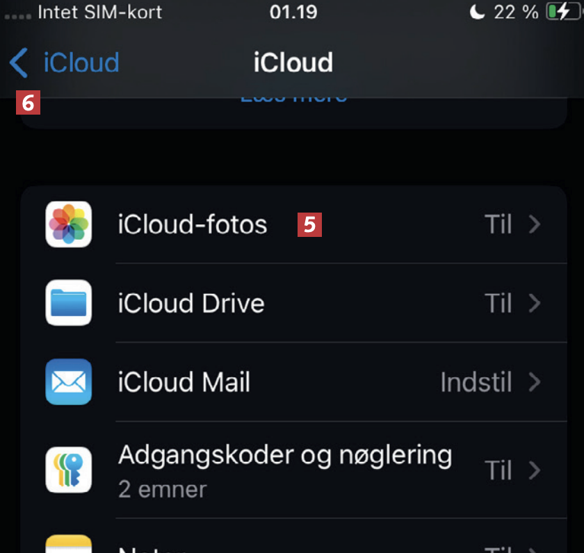 Hvis du ikke betaler for ekstra plads hos iCloud, skal du trykke på iCloud-fotos 5 og slå sikkerhedskopien af fotos fra. Tryk pil tilbage i toppen 6.