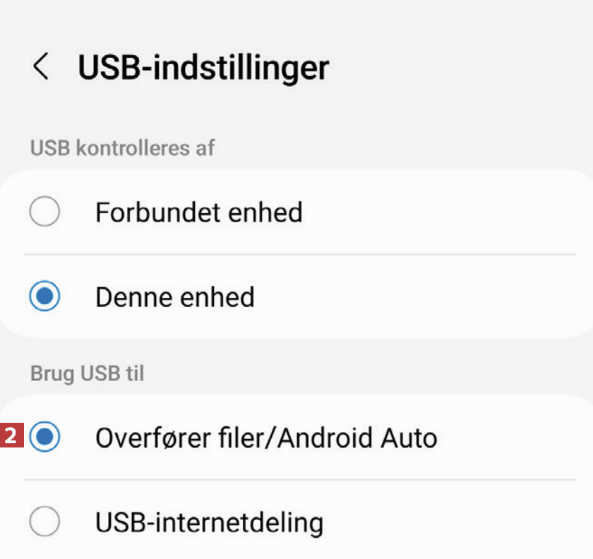Lås din telefon op, og tilslut et ladekabel. Slut den anden ende til en ledig USB-port på din pc. Træk ned fra toppen af skærmen og vælg Tryk for andre USB-indstillinger 1.